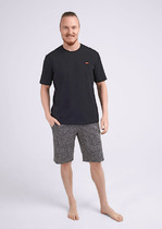 Костюм мужской, состоящий из футболки и брюк. Футболка однотонная с принтом на груди; модель свободная, со спущенной линией плеч, втачными рукавами, овальным вырезом горловины. Брюки из полотна с набивным рисунком эксклюзивного дизайна, прямые, с боковыми карманами с обтачными входами, на притачном поясе с отстроченной эластичной тесьмой.