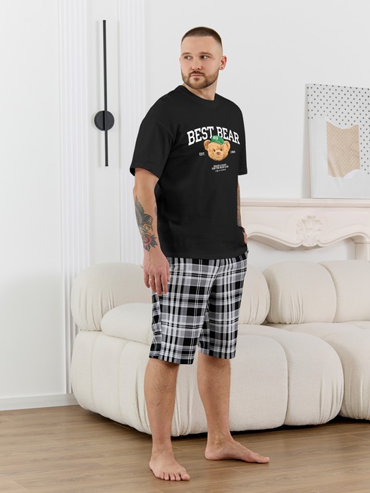 Костюм мужской, состоящий из футболки и шорт. Футболка однотонная с принтом на груди; модель свободная, со спущенной линией плеч, втачными рукавами, овальным вырезом горловины. Шорты из полотна с набивным рисунком эксклюзивного дизайна, с боковыми карманами с обтачными входами, на притачном поясе с отстроченной эластичной тесьмой.