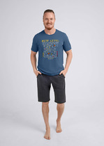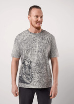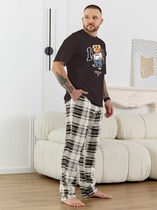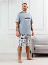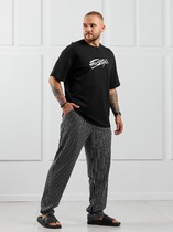 Костюм мужской, состоящий из футболки и брюк. Футболка однотонная с принтом на груди; модель свободная, со спущенной линией плеч, овальным вырезом горловины. Брюки из полотна с набивным рисунком эксклюзивного дизайна, прямые, с боковыми карманами с обтачными входами, на притачном поясе с отстроченной эластичной тесьмой.