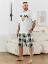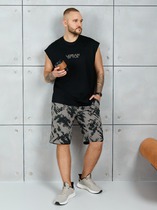 Костюм мужской, состоящий из футболки и шорт. Футболка однотонная с принтом на груди; модель свободная, со спущенной линией плеч, овальным вырезом горловины. Шорты из полотна с набивным рисунком эксклюзивного дизайна, с боковыми карманами с обтачными входами, на притачном поясе с отстроченной эластичной тесьмой.