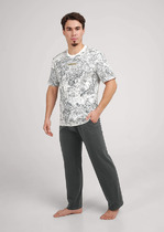 Костюм мужской, состоящий из футболки и шорт. Футболка однотонная с принтом на груди; модель свободная, со спущенной линией плеч, овальным вырезом горловины. Шорты из полотна с набивным рисунком эксклюзивного дизайна, с боковыми карманами с обтачными входами, на притачном поясе с отстроченной эластичной тесьмой.