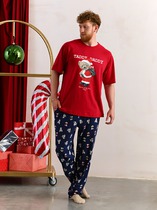 Костюм мужской из трикотажного полотна "кулирка" в комбинации двух видов: гладкокрашенного красного цвета и с набивным тематическим рисунком на сером фоне , состоящий из футболки и брюк. Футболка - классического силуэта, свободного покроя, с приспущенным плечом, с втачными рукавами длиной до локтя, горловиной овальной формы, обработанной втачной планкой и принтом в центре переда. По шву втачивания планки настрочена декоративная (5-ниточная) отделочная строчка нитками контрастного цвета Подгибка низа рукавов и изделия так же выполнена с применением декоративной отделочной строчки. Брюки выполнены из полотна с набивным тематическим рисунком, длинные, умеренной ширины, прямые, на притачном поясе с эластичной тесьмй внутри и карманами в боковых швах.