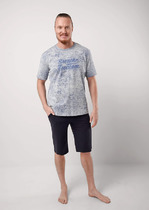 Костюм мужской, состоящий из футболки и брюк. Футболка однотонная с принтом на груди; модель свободная, со спущенной линией плеч. Брюки из полотна с набивным рисунком в узкую черно-белую полоску, прямые, с боковыми карманами с обтачными входами, на притачном поясе с отстроченной эластичной тесьмой.