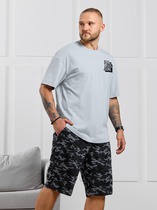 Костюм мужской, состоящий из футболки и шорт. Футболка однотонная с принтом на груди; модель свободная, со спущенной линией плеч. Шорты из полотна с набивным рисунком в узкую черно-белую полоску, с боковыми карманами с обтачными входами, на притачном поясе с отстроченной эластичной тесьмой.