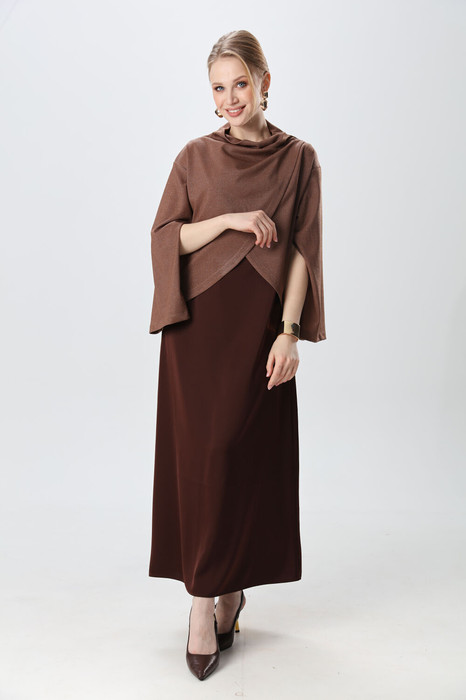 Костюм двухпредметный: состоит из джемпера и платья. Элегантный укороченный джемпер-кейп прямого свободного силуэта с округлой горловиной и фигурным лифом. Рукав втачной широкий, от линии локтя до запястья есть дополнительное отверстие для рук. Платье прямого силуэта, с небольшим расширением к низу, длиной макси. Перед с нагрудной вытачкой из бокового шва. Вырез горловины переда и спинки имеют V-образную форму.
