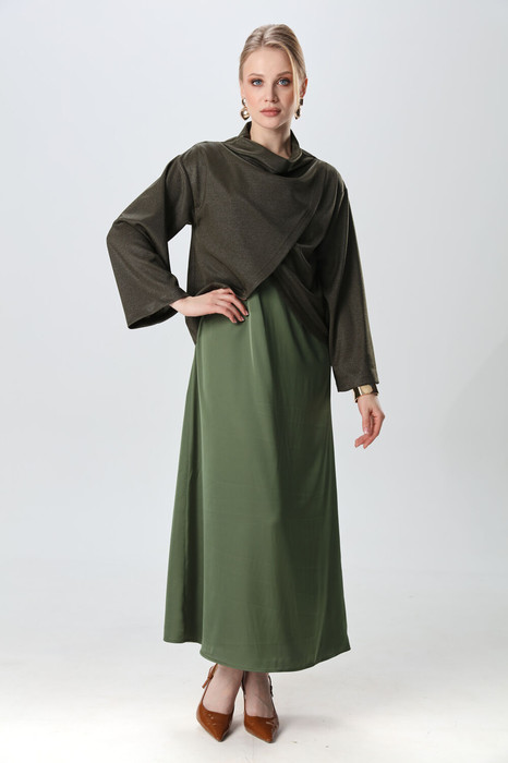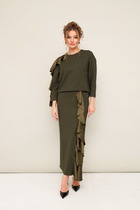Костюм двухпредметный: состоит из джемпера и платья. Элегантный укороченный джемпер-кейп прямого свободного силуэта с округлой горловиной и фигурным лифом. Рукав втачной широкий, от линии локтя до запястья есть дополнительное отверстие для рук. Платье прямого силуэта, с небольшим расширением к низу, длиной макси. Перед с нагрудной вытачкой из бокового шва. Вырез горловины переда и спинки имеют V-образную форму.
