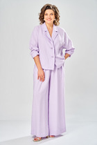 Костюм двухпредметный: состоит из блуза и юбки. Блуза прямого кроя с центральной застёжкой на петли и пуговицы. Вырез горловины глубокий округлый. Линия плеча приспущена. На рукавах изделия заложена декоративная сборка с регулируемыми завязками (кулиса). В комплект к изделию идёт узкий пояс из основной ткани с авторским украшением ручной работы. Юбка - солнце с узким поясом. В боковых швах расположены карманы. Застёжка на петлю и пуговицу и молнию по спинке.