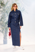 Костюм двухпредметный из облегченного денима: состоит из рубашки и юбки. Укороченная рубашка прямого кроя со спущенной линией плеча. Горловина обработана рубашечным воротником с отрезной стойкой. Застёжка центральная на кнопки. Спереди есть нагрудные карманы. Низ рукава обработан притачной манжетой, застёгивается на кнопки. Юбка длиной миди, расклешенная к низу, с асимметричным низом. Пояс притачной, по спинке собран на резинку. Переднее полотнище состоит из трех частей. Правая часть скреплена отделочной строчкой и кнопками. В боковых швах изделия расположены карманы. По спинке изделия идёт средний шов и две вытачки для удачной посадки по фигуре. Юбка без подкладки.