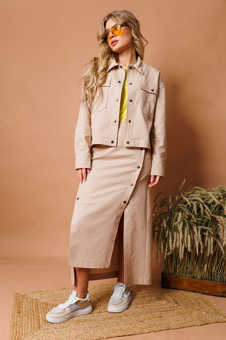Костюм двухпредметный из облегченного денима: состоит из рубашки и юбки. Укороченная рубашка прямого кроя со спущенной линией плеча. Горловина обработана рубашечным воротником с отрезной стойкой. Застёжка центральная на кнопки. Спереди есть нагрудные карманы. Низ рукава обработан притачной манжетой, застёгивается на кнопки. Юбка длиной миди, расклешенная к низу, с асимметричным низом. Пояс притачной, по спинке собран на резинку. Переднее полотнище состоит из трех частей. Правая часть скреплена отделочной строчкой и кнопками. В боковых швах изделия расположены карманы. По спинке изделия идёт средний шов и две вытачки для удачной посадки по фигуре. Юбка без подкладки.