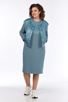 Костюм трехпредметный: состоит из жакета, жилета и брюк. Жакет прямого силуэта на подкладке. Спинка со средним швом. На полочке нагрудная вытачка переведена в прорезной карман с клапаном и листочкой. Линия плеч расширена. Рукава втачные, длинные, двухшовные. Воротник отложной, пиджачного типа на отрезной стойке. Однобортная застежка на петли и пуговицы. Жилет полуприлегающего силуэта на подкладке. По переду вытачка, переходящая в подрез, функциональный карман. Застежка на петли-пуговицы. По спинке вытачки и хлястик. Элегантные брюки прямого кроя с боковыми карманами с отрезным бочком. Застежка на молнию и пуговицу. По переду - складки. Задние половинки с талиевыми вытачками и прорезными карманами с листочкой. Верхний срез обработан притачным поясом. Низ обработан швом в подгибку.