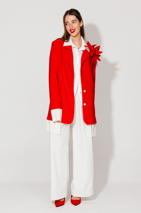 Костюм двухпредметный: состоит из брюк и жакета.  Жакет прямого силуэта на подкладке. Спинка со средним швом. На полочке нагрудная вытачка переведена в прорезной карман с клапаном и листочкой. Линия плеч расширена. Рукава втачные, длинные, двухшовные. Воротник отложной, пиджачного типа на отрезной стойке. Однобортная застежка на петли и пуговицы. Отделочные детали из трикотажного гофре по низу рукава и самого изделия создают имитацию рубашки. Элегантные брюки прямого кроя с боковыми карманами с отрезным бочком. Застежка на молнию и пуговицу. По переду - складки. Задние половинки с талиевыми вытачками и прорезными карманами с листочкой. Верхний срез обработан притачным поясом, по спинке на резинке. Брошь не входит в комплект.