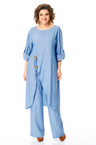 Костюм двухпредметный: состоит из блузы и брюк. Блуза свободного прямого кроя прямого силуэта с V-образным вырезом. Воротник стояче-отложной рубашечного типа, застёгивается на декоративную пуговицу и петлю. Рукава объёмные, собраны на резинку. В боковых швах и по переду разрезы. Брюки с притачным поясом и с карманами в боковых швах..