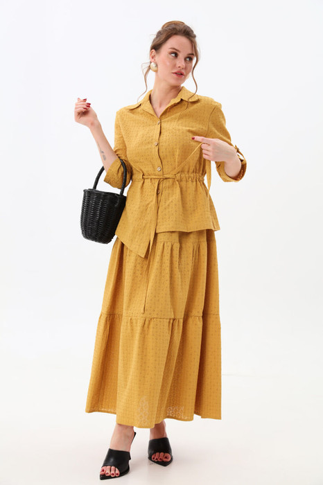 Костюм двухпредметный: состоит из жакета и юбки. Жакет прямого силуэта, воротник пиджачного типа, рукав одношовный, втачной с незначительно спущенной линией плеча, длиной три четверти, с патой. По линии ткани настрачная кулиса с завязками из основной ткани. Застежка центрально-бортовая. Линия низа верхней части фигурная ассиметричная. Юбка - солнце макси с узким поясом на резинке с тремя воланами.