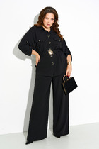 Костюм двухпредметный: состоит из джемпера и юбки. Джемпер-кейп прямого свободного силуэта. Горловина с цельнокроеным воротником-стойкой. Рукав втачной широкий, от линии локтя до запястья есть дополнительное отверстие для рук. Декорирован цветком из контрастной ткани. Юбка - солнце с узким поясом. В боковых швах расположены карманы. Застёжка на петлю и пуговицу и молнию по спинке.
