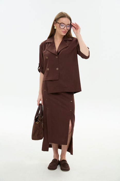 Костюм двухпредметный: состоит из жакета и юбки. Жакет прямого силуэта с имитацией центральной застёжки на пуговицы. Рукав втачной одношовный, длиной три четверти,застегивающийся на пату. Воротник пиджачного типа . Линия низа фигурная, симметричная . Юбка длиной миди, расклешенная к низу, с асимметричным низом. Пояс притачной, по спинке собран на резинку. Переднее полотнище состоит из трех частей. Правая часть скреплена отделочной строчкой и кнопками. В боковых швах изделия расположены карманы. По спинке изделия идёт средний шов и две вытачки для удачной посадки по фигуре. Юбка без подкладки.