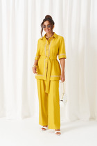 Костюм двухпредметный: состоит из жакета и брюк. Жакет рубашечного типа прямого силуэта с асимметричным низом. Рукав втачной со спущенной линией плеча, фиксируется на пату. Застежка центральная на петли и пуговицы, смещённая по косой. Воротник отложной на стойке до половины спинки. Брюки свободного кроя, верхний срез представлен широкой резинкой, с карманами. По центру правой брючины расположена планка с функционирующими петлями и пуговицами.