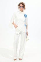 Блузка женская, полуприлегающего силуэта, с ассиметричным низом, перед и спинка на трикотажной подкладке. Длина по среднему шву спинки 59 см. Левая и правая части переда образуют запах. Правая часть переда отрезная по линии талии, с двумя застроченными односторонними складками, из левого бокового шва. Левая часть переда с застроченной встречной складкой, идущей от плечевого шва вниз. Спинка с рельефами, идущими от пройм до низа, со средним швом, в верхней части которого расположена застежка на потайную тесьму-"молнию". Горловина спинки округлой формы, по переду V- образная, углубленная.      Рукава втачные, одношовные. Длина рукава 20 см. Блузка с плечевыми накладками, со съемным декоративным цветком «роза», выполненным из "сатина".