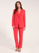 Комплект брючный 2-х предметный, состоящий из блузки и брюк. Блузка полуприлегающего силуэта, выполнена из вискозного полотна. Модель с плечевыми накладками и разрезами в боковых швах. Перед декорирован вставками с застроченными вертикальными защипами и отрезными фигурными планками, застегивающимися на 3 петли и 3 пуговицы. От планок к швам притачивания вставок направлены навесные петли, застегнутые на пуговицы. Спинка со средним швом; круглая горловина спинки обработана отрезной фигурной бейкой. Рукав короткий, втачной. Длина блузки – 66,5 (46-50 р-р) см, 69 см (52-60 р-р); длина рукава – 19,5 см (46-50 р-р), 20,0 (52-60 р-р) см. Брюки классические, с посадкой на талии, выполнены из вискозного полотна. Модель с центральной застёжкой на тесьму-«молнию», на притачном поясе, застегивающемся на петлю и пуговицу. Передние и задние половинки брюк с талиевыми вытачками, направленными от пояса вниз. Спереди обработаны боковые наклонные карманы. Для лучшего прилегания брюк в области талии в поясе по задним половинкам вставлена эластичная лента. Длина брюк по боковому (с поясом) – 101,5 см (46-50 р-р), 102,5 см (52-54 р-р), 103,5 см (56-60 р-р).