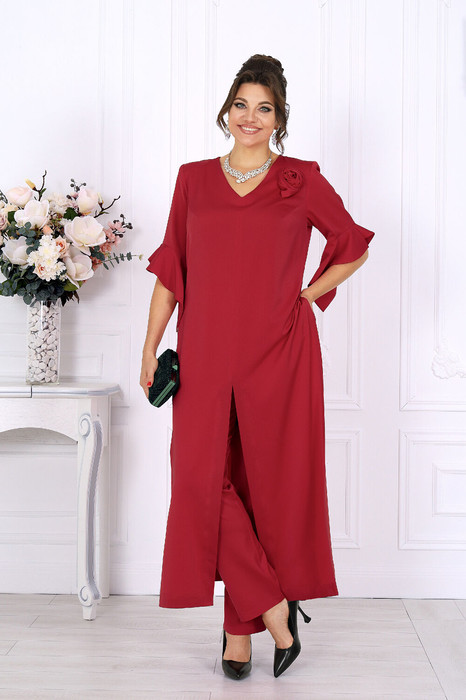 Туника полуприлегающего силуэта, выполнена из костюмно-плательного сатина. Модель без подкладки, с плечевыми накладками. Перед с нагрудными вытачками, направленными от пройм, и средним швом, в нижней части которого обработан разрез. Спинка с талиевыми вытачками и средним швом, в верхней части которого расположена застежка на потайную тесьму-«молнию», в нижней части-разрез. Ширина отделочной строчки по центральным разрезам переда и спинки – 4 см. В боковых швах высокие разрезы расположены от уровня талии до низа. Ширина отделочной строчки по боковым разрезам – 1 см. V-образный вырез горловины переда переходит в округлый по спинке. Рукав втачной, с асимметричным обтачным воланом по низу. Туника дополняется съемным декоративным цветком «роза», выполненным из основной ткани. Длина туники – 133,5 см (46-52 р-р), 135 см (54-62 р-р).