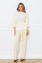 Брюки классические длинные, прямого силуэта, с посадкой на талии, выполнены из костюмно-плательного сатина. Модель с центральной застёжкой на тесьму-«молнию», на притачном поясе со шлевками, застегивающемся на петлю и пуговицу. Передние половинки брюк с двумя, застроченными от пояса вниз, односторонними складками, с боковыми наклонными карманами. Задние половинки брюк с талиевыми вытачками, направленными от пояса вниз. Для лучшего прилегания брюк в области талии в поясе по задним половинкам вставлена эластичная лента. Длина брюк по боковому (с поясом) 100,5 см (46-48 р-р); 101,5 см (50-52 р-р); 102,5 см (54-56 р-р); 104,0 см (58-62 р-р).