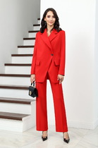 Комплект женский, состоящий из жакета и платья. Укороченный жакет полуприлегающего силуэта на подкладке. Деталь переда с двумя талевыми вытачками и с фигурным подрезом около горловины. Спинка со средним швом и рельефами, выходящими из проймы вниз. Рукава втачные, двухшовные, длиной 48,0 см., с разрезом по локтевому шву. Горловина углубленная, круглая, обтачная. Борта круглые, застежка на навесную петлю-пуговицу. Изделие с плечевыми накладками. Платье полуприлегающего силуэта, отрезное по линии талии. На детали переда рельефы выходят из проймы, проходят через центр груди вниз.  Спинка цельнокроеная, с талевыми выточками. Юбка широкая к низу, с тремя клиньями спереди и сзади.  Посередине каждого клина зашиты встречные складки. В левом боковом шве обработана застежка на потайную тесьму молнию. Рукава втачные, одношовные. Горловина углубленная, обтачная, с вырезом в виде “капельки” посредине переда. Углы выреза скреплены украшением. Пояс отлетной, обтачной, из двух цветов ткани, с перекантом на лицо и с застежкой на петлю-пуговицу сзади.  Изделие с плечевыми накладками.