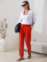 Брюки из костюмной ткани идеально дополняют верх, создавая лаконичную вертикаль, которая делает образ ещё более пропорциональным.
