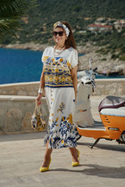 Туника полуприлегающего силуэта с расширением к низу, выполнена из трикотажного полотна с фактурной лицевой стороной «люрекс». Модель отрезная по линии талии; верхняя часть переда и спинки (лиф) на трикотажной подкладке. Лиф переда с одним рельефным швом, направленным от левой проймы; нижняя часть переда состоит из двух деталей, скрепленных на запах. По линии талии, вдоль рельефа, перед задрапирован сборкой и односторонними складками. На спинке обработаны талиевые вытачки и средний шов с застежкой на потайную тесьму-«молнию» (50 см). Вырез горловины спинки и переда формы «лодочка». Рукав без шва, с отлетными краями; крепится к пройме только в верхней части. Длина туники – 139 см; длина рукава – 51 см.