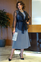Комплект женский, 2-х предметный, состоящий из жакета и платья. Жакет полуприлегающего силуэта, выполнен из костюмно-плательной ткани. Модель на подкладке, с плечевыми накладками. Перед с рельефными швами, выходящими из пройм до низа и нагрудными вытачками, направленными от рельефов к центру груди. Борта прямые, без застежки, не доходят до центра переда. Спинка со средним швом и рельефами, идущими от плеча до низа. Горловина округлой формой, спереди углубленная. Рукав втачной, длинный. Жакет декорирован несъемным «цветком» из основной ткани. Длина жакета – 56 см; длина рукава – 60 см. Платье полуприлегающего силуэта, выполнено из костюмно-плательной ткани. Модель на трикотажной подкладке, с плечевыми накладками. Перед отрезной по линии талии. Верхняя часть с нагрудными вытачками, идущими из пройм и двумя вертикальными подрезами по центру. В нижней части расположены талиевые вытачки, выходящие из подреза. Горловина и вставка лифа переда декорированы пришивными перламутровыми бусинами. Спинка с талиевыми вытачками и средним швом, в верхней части которого обработана застежка на потайную тесьму-«молнию» (50см), а в нижней - шлица. Горловина округлой формы, по переду углубленная. Рукав втачной, длиной 3/4. Длина платья – 106 см; длина рукава – 40 см.