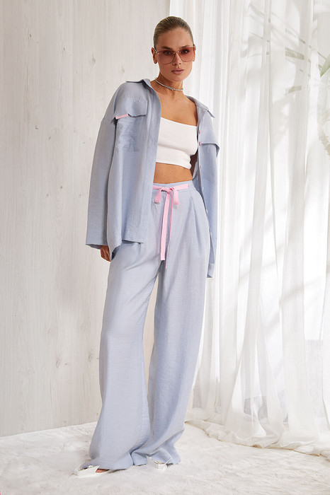 Костюм из тонкого льна, состоящий из рубашки и брюк. Стильная рубашка-блуза прямого кроя длиной до середины бедра. Центральная бортовая застежка доверху на петли и пуговицы. Накладные карманы и клапаны по переду изделия. Отрезная кокетка и бантовая складка по спинке. Спущенная линия плеча, свободный длинный рукав. Рубашечный воротник на стойке. Широкая подгибка рукава.