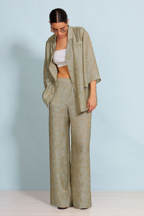 Элегантный костюм, состоящий из брюк и блузы. Блуза прямого силуэта, длиной до бедер. Центральная бортовая застежка на петли и пуговицы. Воротник рубашечный. Немного спущенная линия плеча. Свободный рукав , немного расширенный книзу.. Спинка прямая. Изделие без подкладки. Брюки прямые, свободного кроя, без подкладки. Брюки на резинке (без застежки). Карманы в боковых швах.