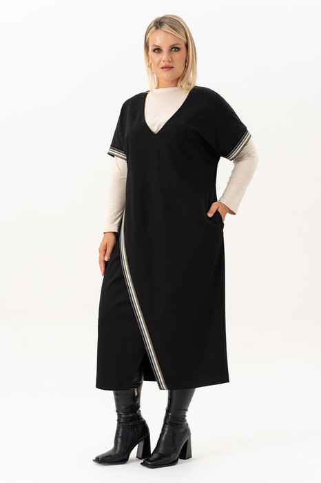 Для офиса и для прогулок, для деловой встречи, корпоратива и даже для школы - этот сарафан свободного покроя подойдет для любого случая. Модель дополнена базовой футболкой с длинным рукавом, Ваш стильный повседневный образ готов! Этот женский офисный сарафан выполнен из трикотажного полотна «Лакоста» - удобного и приятного к телу материала с основой из вискозы , в котором будет комфортно, ткань хорошо держит форму и отличается устойчивостью к износу. Разрез по переду изделия и проймы обработаны декоративной тесьмой. В левом боковом шве обработан карман, линия плеча спущена.  Лонгслив выполнен из трикотажного полотна «Кулирка» на основе хлопка. Мы сшили эту модель в больших размерах, чтобы ее могли подобрать для себя обладательницы пышных форм. Этот наряд отлично впишется в строгий  образ деловой дамы. Стильный сарафан элегантно впишется в нарядный и повседневный образ. Он подойдет как  для любого праздничного мероприятия, так и на  каждый день .
