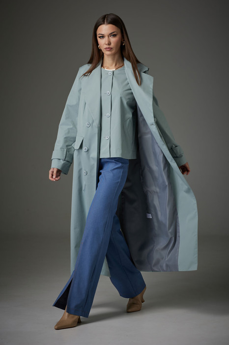 Жилет удлиненный до середины икры, застежка двубортная на петли-пуговицы. Горловина оформлена воротником пиджачного типа. На спинке расположен средний шов со шлицей.