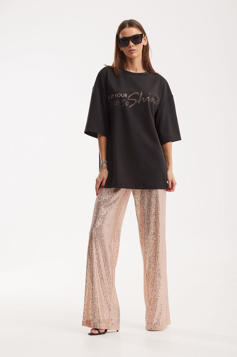 Брюки выполнены из трикотажного полотна-сетки с пайетками, покроены по косой. Верхний срез оформлен цельнокроеным поясом на резинке. На задних половинках расположены талиевые вытачки. Брюки прямые, слегка расширены книзу, полностью на подкладке.