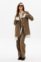 Жилет полуприлегающего силуэта со спущенным плечом. Застежка двубортная, ассиметричная на кнопку и отделочную пуговицу-брошь. Нижний край борта фиксируется шнурками. Правый борт длиннее, левый короче. Спинка со средним швом и вытачками.