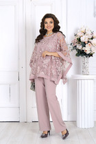 Брюки расширенные к низу, со складкой на передней половинке, застроченной сверху. Брюки с завышенной талией, верхний срез обработан обтачкой. В боковых швах наклонные карманы. На задних половинках по две талиевые вытачки, отстроченные отделочными строчками на 0,2см. Застежка на молнию и две отделочные пуговицы.