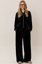 Шикарный костюм свободного силуэта. Застежка на две декоративные металлические кнопки. Воротник пиджачного типа. Рукав спущенный с патой, застегивающейся на пуговицу. Низ фигурной формы. Брюки свободные, зауженные к низу, с вертикальной вставкой вдоль бокового шва. По переду заложены односторонние складки. По спинке отрезная кокетка. Карманы в боковых швах. Верхний срез обработан притачным поясом.