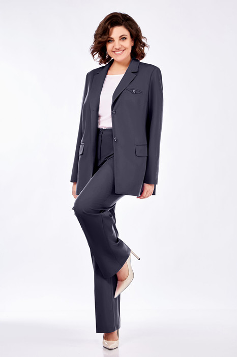 Костюм трехпредметный: жакет, блузка, брюки. Жакет прямого силуэта, на подкладке, с нагрудными вытачками, карманы с клапанами в рамку, в верхней части декоративная листочка с пуговицей, по спинке средний шов с глубокой шлицей, начинается на уровне лопаток. Рукав двухшовный, по локтевому шву шлицы с застежкой на четыре пуговицы. Блузка прямого силуэта, с нагрудными вытачками, разрезами в боковых швах, без рукава. Брюки слегка заужены к низу, на поясе, по спинке  резинка, застежка на пуговицу  и тесьму-молнию, с наклонными карманами к боковому шву, справа на заднем полотнище декоративный карман в рамку с пуговицей.