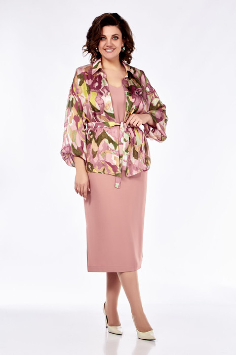 Шикарный двухпредметный комплект. Платье полуприлегающего силуэта, с разрезом в боковом шве и V образным вырезом горловины, обработанным обтачкой, нагрудные вытачки, молния по спинке, короткий рукав. Блузка из шелковой ткани, мягкая, приятная на ощупь. Рубашечный воротник, спущенная линия плеча, рукав свободный на манжете, разрезы в боковых швах. В комплекте пояс из основной ткани.