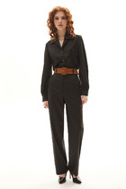 Костюм из льняной ткани. Блуза полуприлегающего силуэта, рубашечный воротник с центральной  застежкой на пуговицы. Слева накладной карман из отделочной ткани. Рукав спущенный со вставкой из отделочной ткани и патой длиной три четверти. Брюки заужены к низу, с заутюжеными складками. Брюки на поясе на резинке с карманами к боковым швам. Низ с цельнокроеными манжетами.
