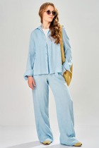 Стильный комплект. Жакет прямого силуэта, воротник с лацканали, застежка на две пуговицы, в боковых швах имитация шлиц с двумя пуговицами. Рукав спущенного кроя, три-четверти с патой на 1 пуговицу. Брюки свободного кроя на резинке, карманы в боковых швах, по низу имитации шлиц и две пуговицы. Блуза однотон, линия плеча спущена.