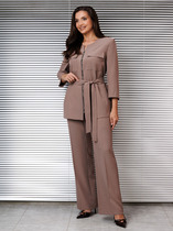 Комплект женский, состоит из блузки, жилета и брюк. Полуприлегающий силуэт, жилет с V-образной формой горловины, на переде рельефы от проймы, имитация карманов в рамку, по спинке хлястик с пуговицей. Блузка с рубашечным воротником и застежкой на петли и пуговицы, нагрудные вытачки, рукав одношовный с манжетой. Разрезы в боковых швах. Брюки прямые, с карманами. Пояс по спинке на резинке. На переде и спинке заутюжены стрелки.
