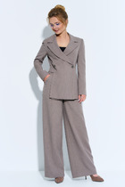 Костюм полуприлегающего силуэта. Элегантный костюм с интересным кроем не оставит Вас равнодушной. Жакет на подкладке с воротником пиджачного типа. Срез борта фигурной формы. По переду рельефы, между которыми декоративный элемент в виде шнуровки. Прорезные карманы в рамку, спинка со средним швом и рельефами. Рукав длинный двухшовный. Брюки слегка расклешенные, на поясе, с застежкой на молнию и петлю и пуговицу. По спинке пояс на резинке. Заутюженные канты по передним и задним полотнищам. Карманы к боковым швам.