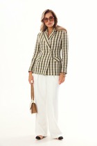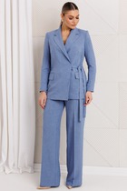 Жакет полуприлегающего силуэта с двубортной застежкой, завязывающейся на пояс. Воротник пиджачного типа. Рукав длинный, двушовный, втачной, плечо слегка расширено. Спинка со средним швом и рельефом из плечевого шва. По переду полурельеф из плеча, заканчивающийся вытачкой, обработаны прорезные карманы с листочкой и клапаном. Низ борта закругленный.