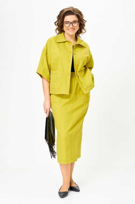 Жакет прямого силуэта, укороченный, со спущенными плечами. Застежка на петли-пуговицы доверху, горловина оформлена стояче-отложным воротником. Перед с нагрудной вытачкой с бокового шва, снизу с большими накладными карманами. Спинка со средним швом. Рукав одношовный, прямой, чуть ниже локтя, с фигурной линией низа, обработан обтачкой. Жакет без подклада.