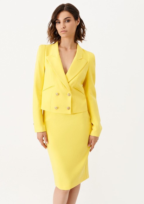 Стильный женский костюм с жакетом и юбкой решит вопрос с созданием образов в официальном стиле. Трикотажный костюм женский хорошо подойдет для прохладного лета и межсезонья. Укороченный жакет с двубортным воротником украшен четырьмя пуговицами, по две в ряд. Дополняет его прямая юбка длиной до колена. Костюм пиджак и юбка женские можно носить самостоятельно или сочетать с майками, футболками, блузками. Для завершения строгих образом подойдут туфли-лодочки на каблуке. Закажите классический юбочный костюм по выгодной цене уже сегодня.
