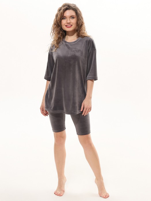Костюм из гладкокрашеного трикотажного полотна «велюр стрейч», состоящий из футболки и леггинсов. Футболка – удлиненная, свободного покроя, со спущенной, линией плеча, короткими втачными рукавами, горловиной овальной формы, обработанной втачной планкой.Леггинсы – длиной до колен, с эластичной тесьмой по талии.
