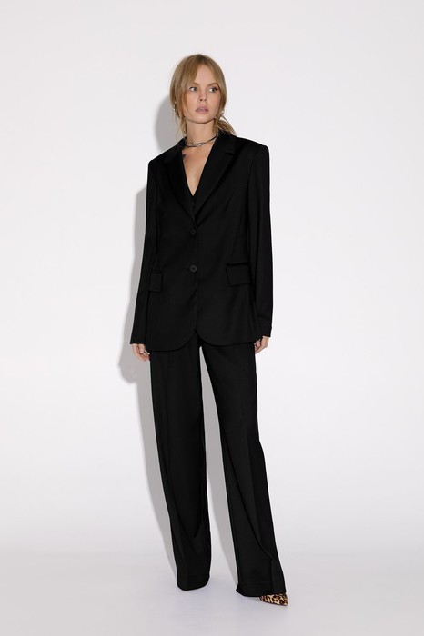Текстильный костюм-двойка из свободного жакета со шлицами и прямых брюк-палаццо