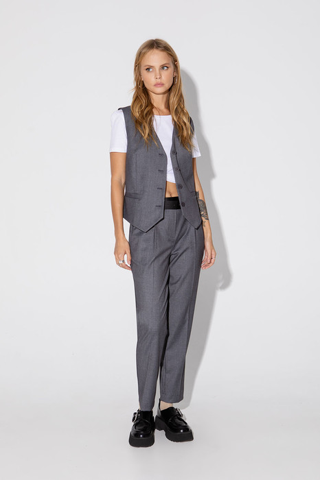 Костюм-двойка из полуприлегающего жилета и укороченных брюк со стрелками. Детали: жилет полуприлегающего силуэта, фигурный низ, талиевые вытачки, застежка на петли и пуговицы, функциональные карманы, на подкладке. Брюки со средней посадкой, притачной пояс со шлевками, передние половины с небольшими мягкими складками и заутюженными стрелками, застежка на молнию и пуговицу, боковые карманы.