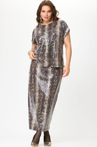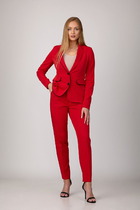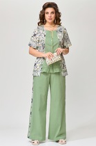 Длина жакета по спинке около 70 см в размерах 40-46 и около 73 см в размерах 48-52, длина рукавов около 62 см. Длина брюк по боковому шву с поясом около 112,5 в размерах 40-46 и около 114 см в размерах 48-52, длина по внутреннему шву около 80 см.