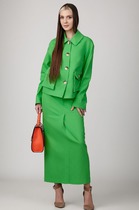 Текстильный костюм-двойка из двубортного полуприлегающего жакета и прямых брюк со стрелками. Детали: жакет с отрезными бочками и нагрудными вытачками, пиджачный воротник, прорезные карманы, застежка на петли и пуговицы, спинка со средним швом, втачные двухшовные рукава, жакет на подкладке. Брюки с высокой посадкой на притачном поясе со шлевками, передние половины с небольшими застроченными мягкими складками и заутюженными стрелками, застежка на молнию и пуговицу, боковые карманы.